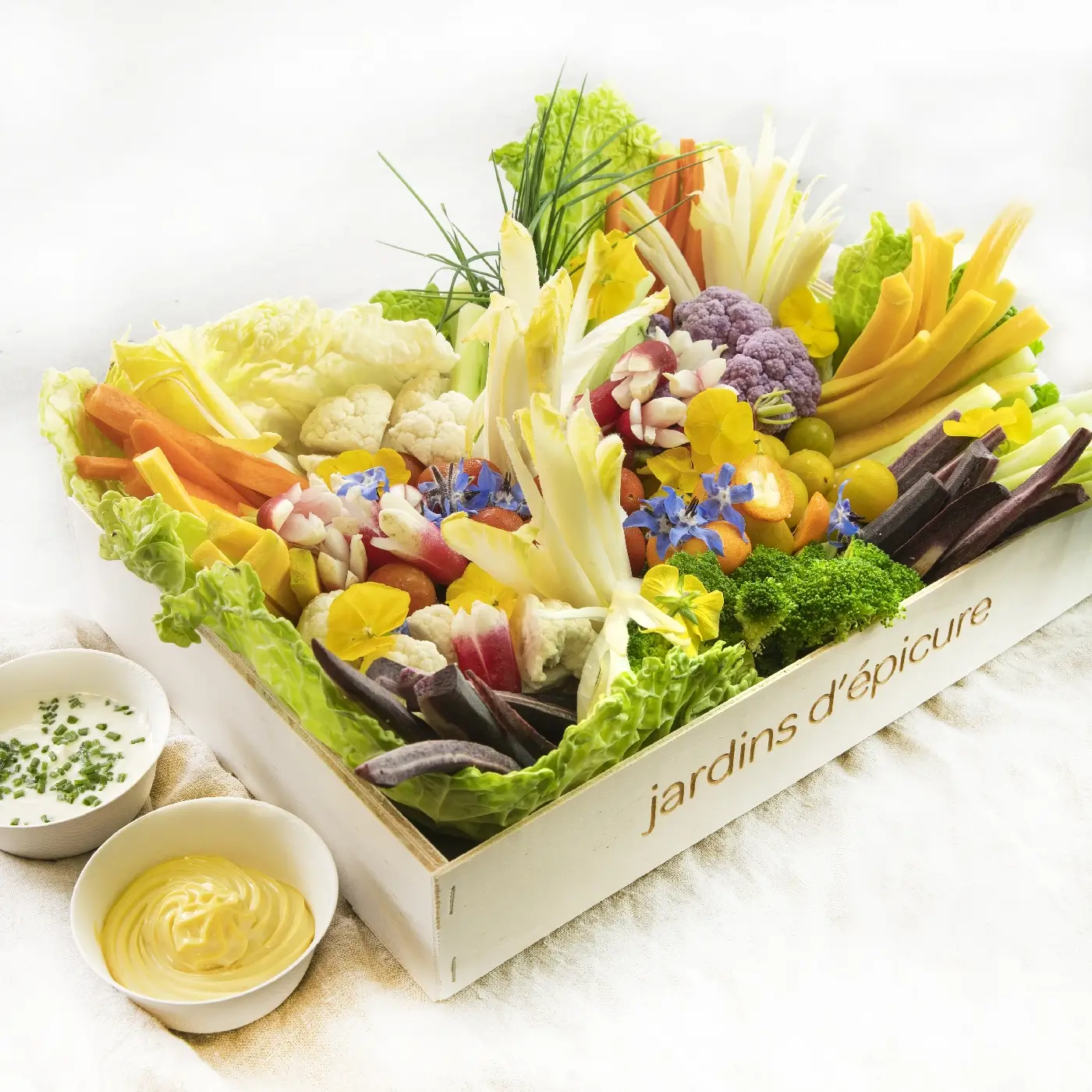 Enchantez vos convives avec un magnifique panier de légumes découpés frais du jour accompagné de ses sauces, idéal pour compléter un buffet ou un cocktail.