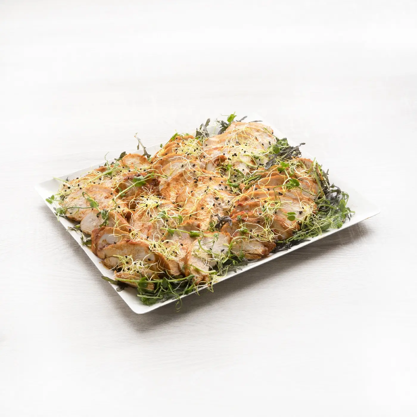 Notre Chef vous propose une planche de blancs de poulet découpés à partager, cuit basse température aux épices douces.