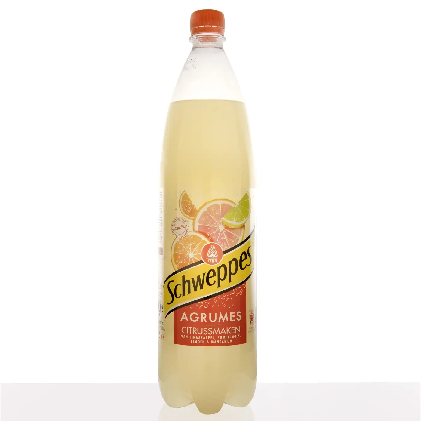 Découvrez le Schweppes Agrumes 1,5 L, une subtile recette aux saveurs de 4 agrumes : orange, pamplemousse, citron vert et mandarine.