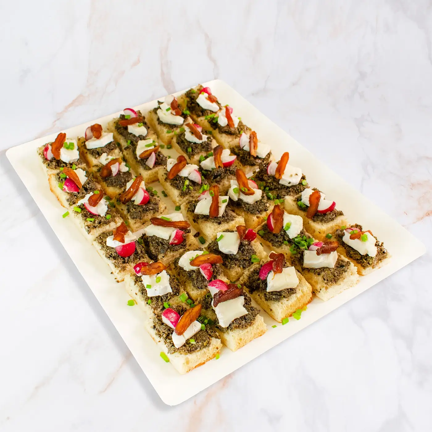 Un plateau délicieux avec des ingrédients naturels, locaux et de saison préparés du jour. Offrez-vous un régal avec notre Plateau de 30 Bruschettas à la Tapenade, Brebis, Radis et Abricots Secs !