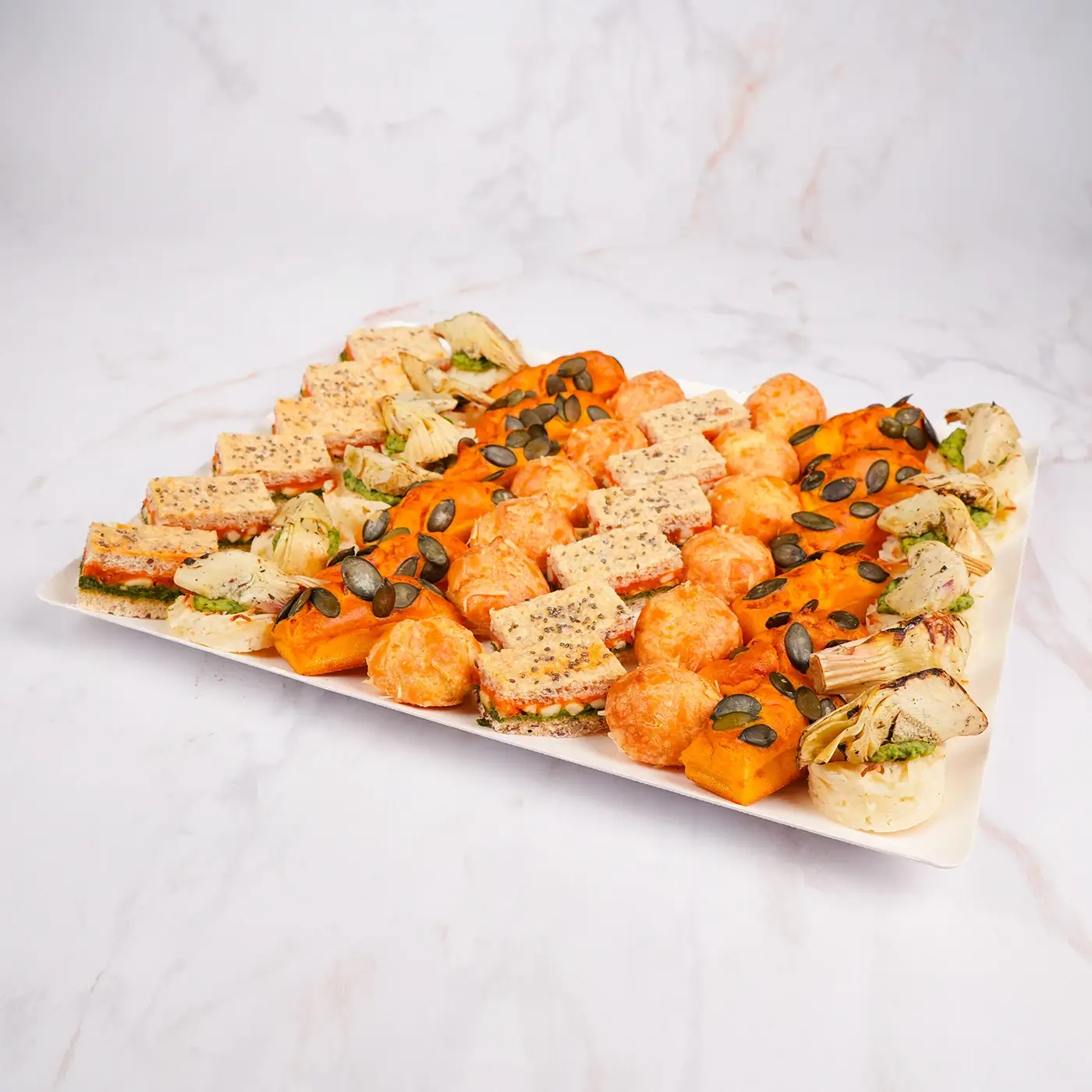 Un assortiment de 48 pièces végétariennes aux accents du Sud pour vos cocktails, déjeuners ou buffets pros :
