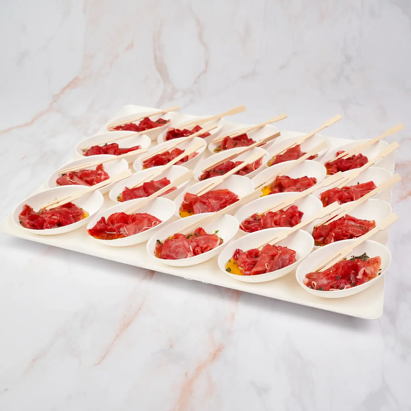 Un plateau de 20 bouchées de carpaccio de bœuf français (certifié VBF), marinées à l’huile d’olive et au basilic frais. Servi froid, élégant et savoureux. Idéal pour vos buffets, cocktails ou réceptions d’entreprise.