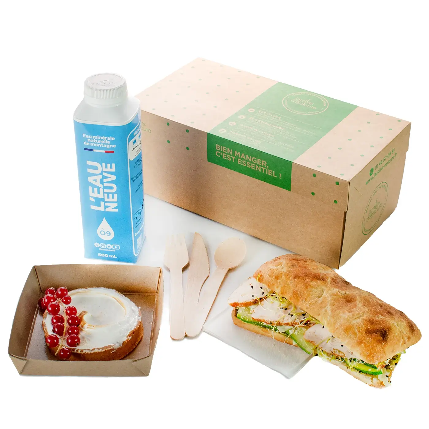 Parfaits pour vos réunions, vos formations ou un déjeuner express à emporter, notre lunch box L’Essentiel Sandwich est présenté dans un packaging pratique, léger et 100% biodégradable, il est accompagné d’un gobelet biodégradable, couverts en bois, serviette et une bouteille brique Tetra Pack d’Eau Minérale Durable 100% recyclable pour un confort de dégustation optimal.